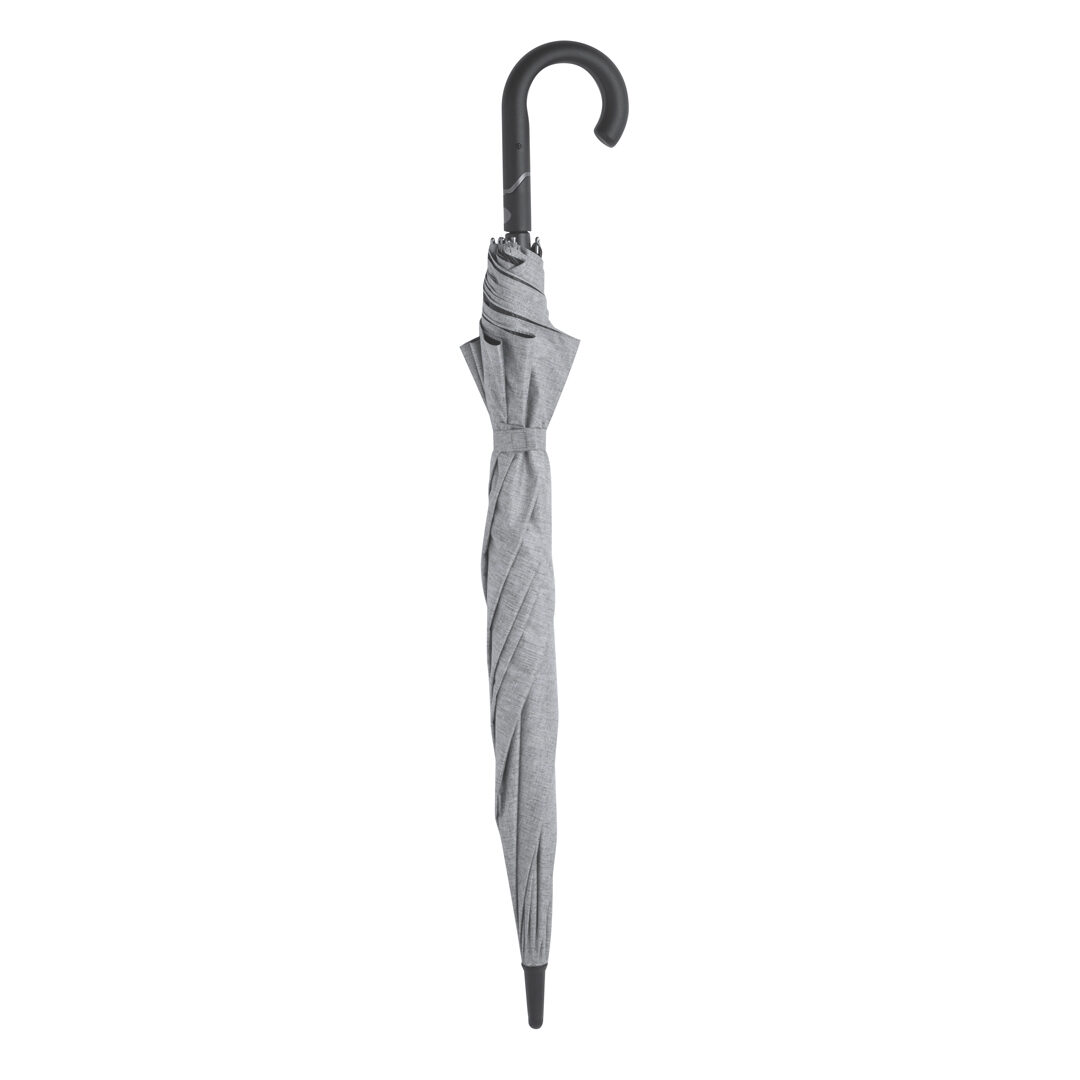 Paraguas de alta calidad y 130cm de diámetro, fabricado en material poliéster 150D y en elegante tono gris jaspeado. Apertura automática y varillas de fibra de vidrio, con sistema antiviento y cierre de velcro. Con mango ergonómico en suave ABS y presentado en bolsa reciclada.