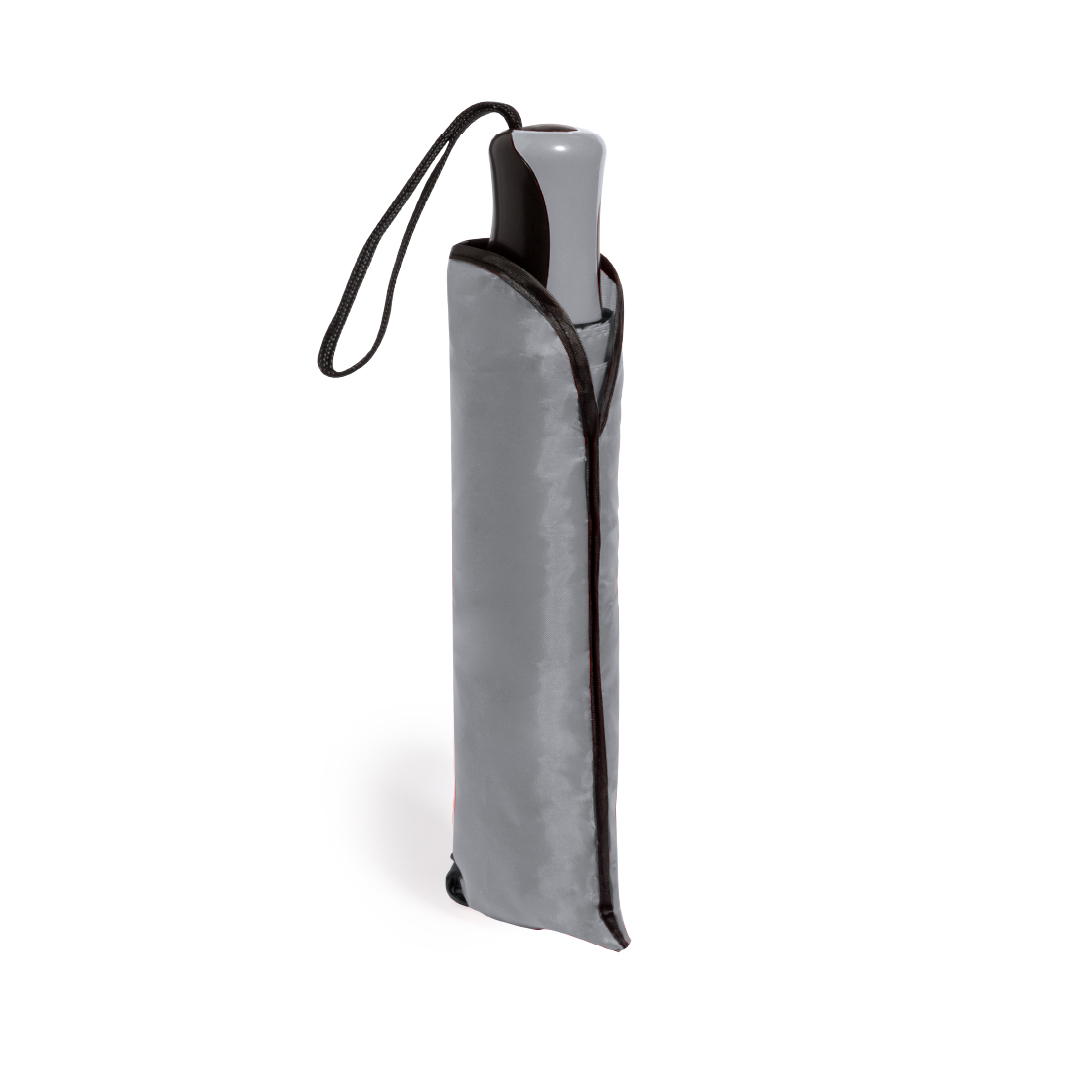 Paraguas plegable de 8 paneles de poliéster 190T. De apertura manual, con varillas metálicas en color plateado y cierre de velcro. Mango ergonómico con cinta de transporte y funda protectora a juego. Disponible en amplia gama de colores. Presentado en bolsa individual reciclada.
