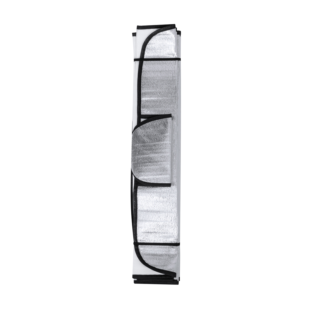 Resistente parasol de aluminio en una cara, diseñado para situarlo en el exterior de la luna delantera y como protección ante fenómenos adversos como la nieve. Incluye dos solapas laterales que se ajustan entre el marco y las puertas del vehículo, proporcionando un aislamiento adicional a la luna delantera. Enrollable y con gomas para un fácil almacenamiento.Presentado en bolsa individual reciclada.
