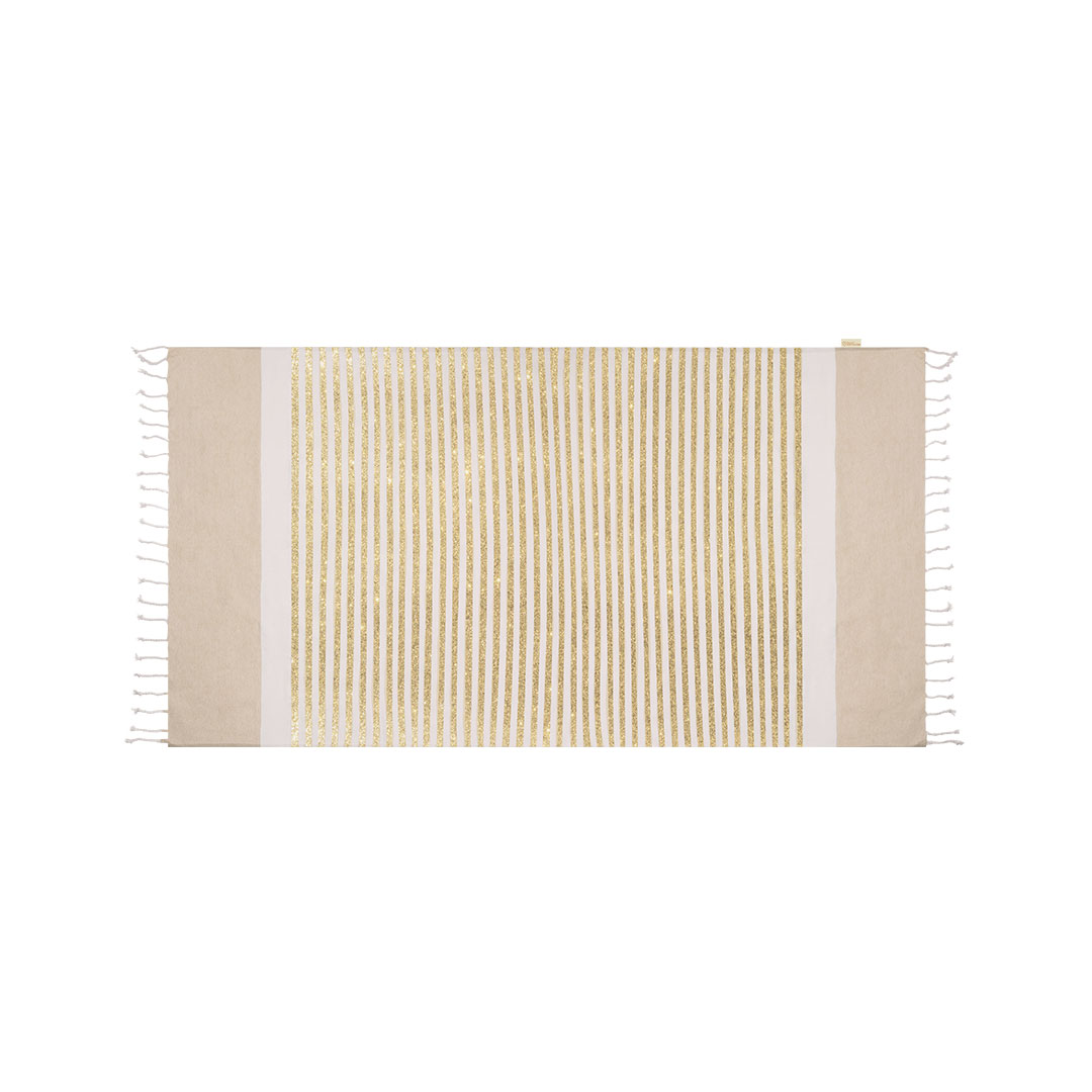 Pareo Toalla en algodón reciclado de 180g/m2. Diseño a rayas color blanco en combinación con rayas doradas con efecto glitter, extremos en beige liso y distinguidos flecos en los extremos en forma de cordón. Incluye etiqueta con distintivo algodón reciclado.