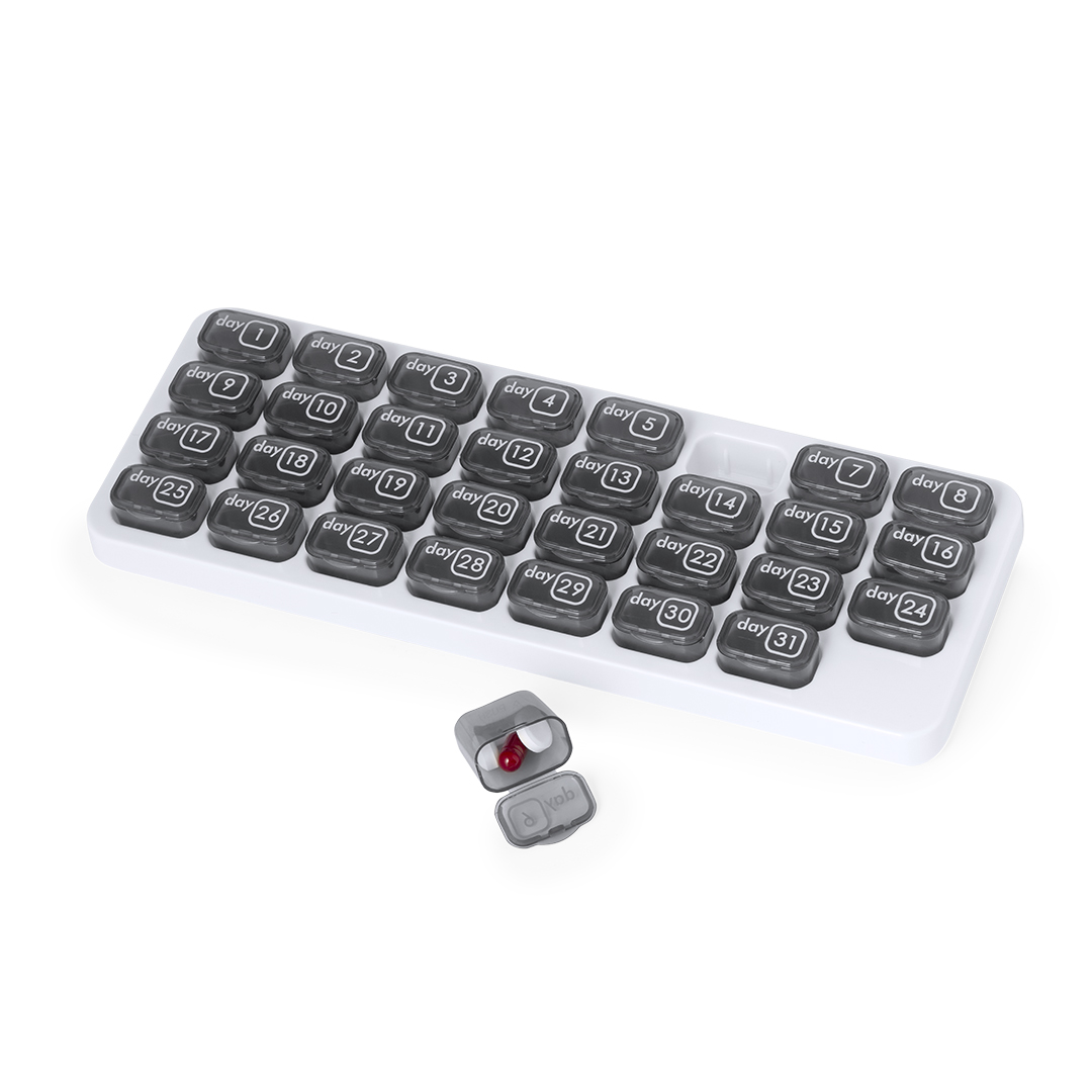 Original pastillero mensual fabricado en resistente PP. Organizador de 31 casillas independientes y extraíbles para guardar día a día todos los comprimidos necesarios. Elegante base blanca y casillas de color gris con el día del mes marcado. Presentado en bolsa individual.