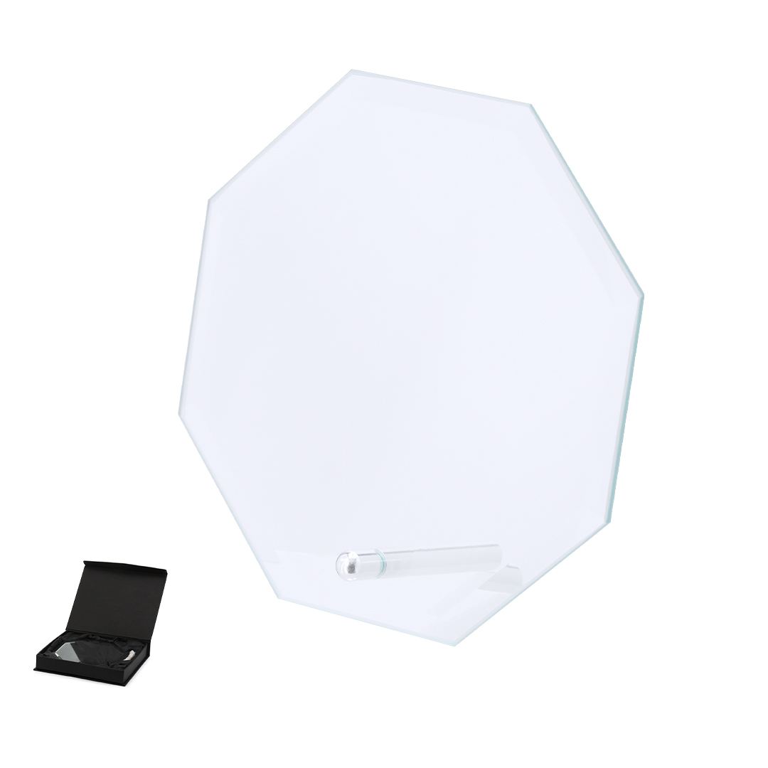Placa trofeo de grueso cristal con elegante diseño octogonal. Especialmente diseñada para marcaje a láser y presentada en estuche de protección individual.