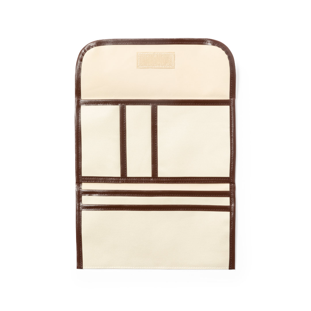 Portadocumentos de viaje fabricado en resistente 600D de acabado natural, con ribetes y refuerzos en polipiel marrón. Solapa con cierre de velcro y multitud de compartimentos interiores.