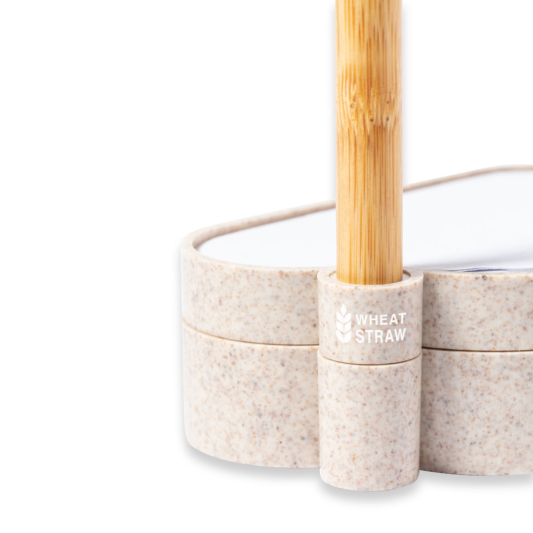 Portanotas semillas de línea nature con original diseño nube. Incluye: Bloc de 80 notas blancas en forma de nube.Base con soporte para bolígrafo y dos compartimentos, con hoja de papel semilla incluida. Fabricado en caña de trigo, para así fomentar la utilización de materias primas naturales y reducir las emisiones contaminantes.Bolígrafo puntero con cuerpo fabricado en bambú capucha y detalles en caña de trigo. En tinta azul.Set presentado en caja individual de diseño kraft, con manual de instrucciones en español e inglés.