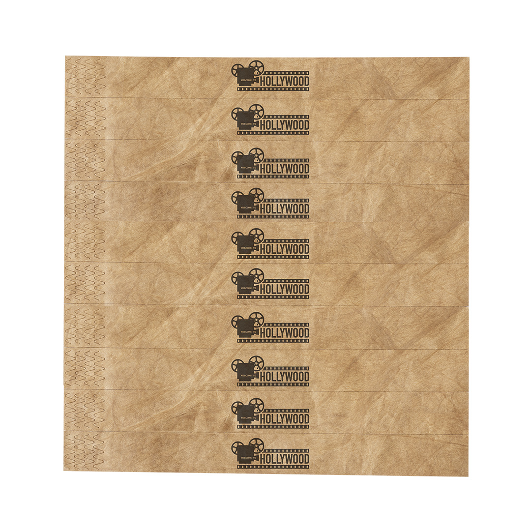 Pulsera para eventos de acabado nature. Fabricada en fibra sintética Tyvek, que destaca especialmente por su resistencia, flexibilidad, durabilidad y facilidad para la impresión. Con cierre adhesivo, talla única para adulto. Resistente al agua. Presentada en plancha troquelada de 10 piezas con numeración individual.