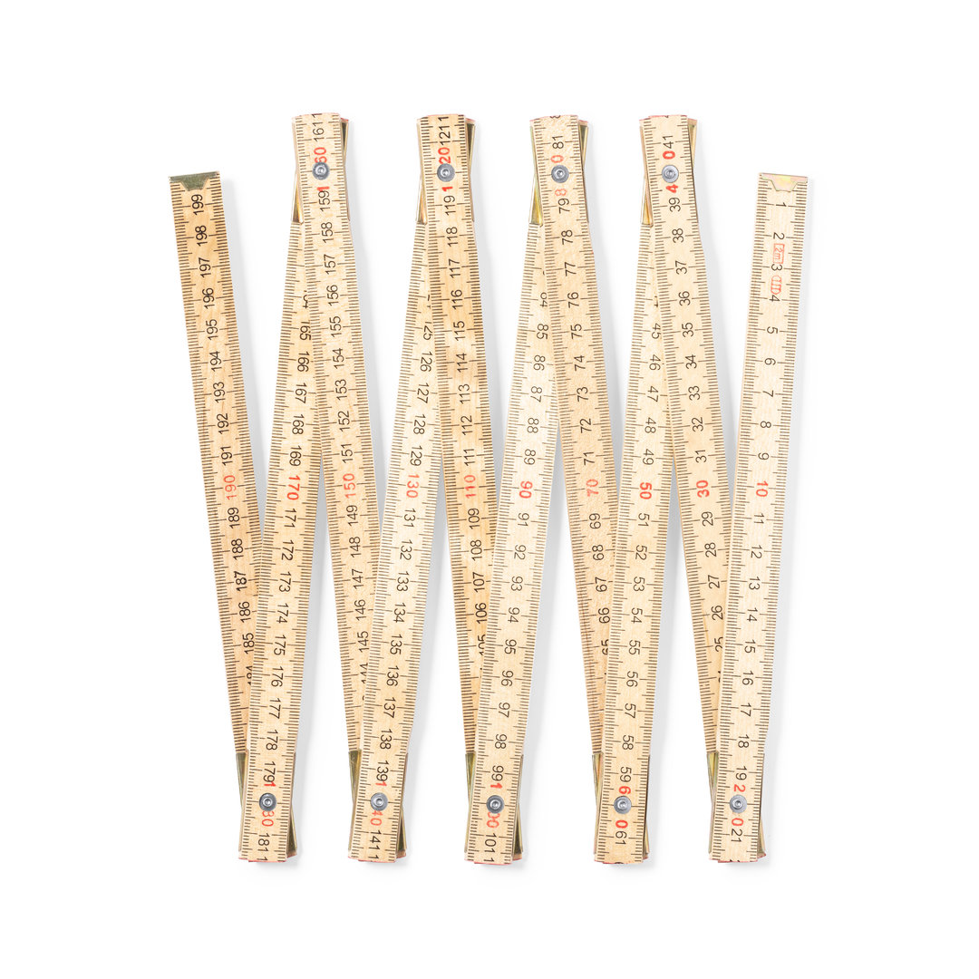 Clásica regla de carpintero fabricada en madera natural. Plegabe, con 10 segmentos y de 2 m de longitud.