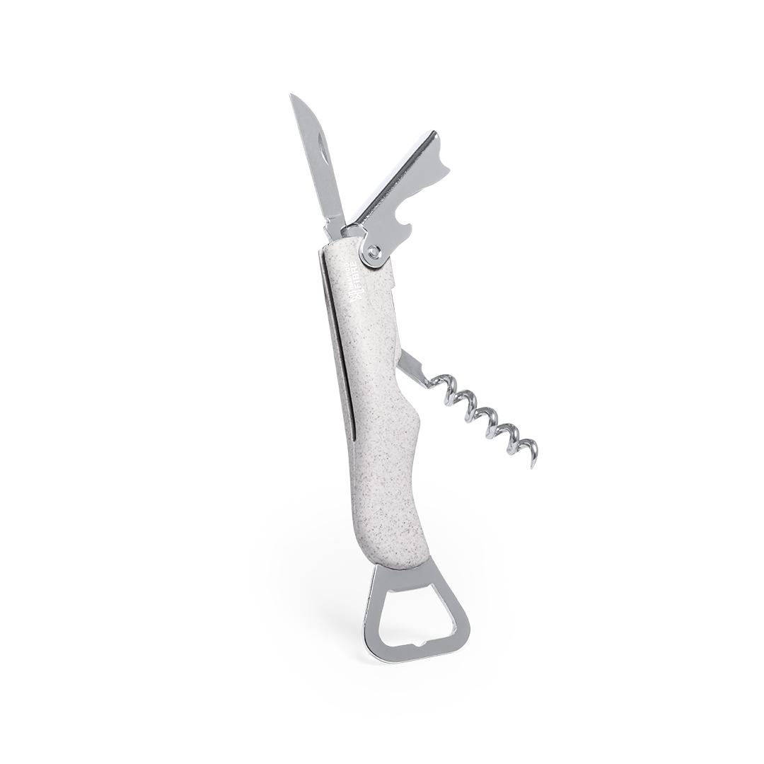 Sacacorchos de línea nature con abridor de botellas y cortacápsulas. Fabricado en fibra de bambú y ABS, con accesorios en acero inox. Presentado en atractiva caja individual de diseño eco.