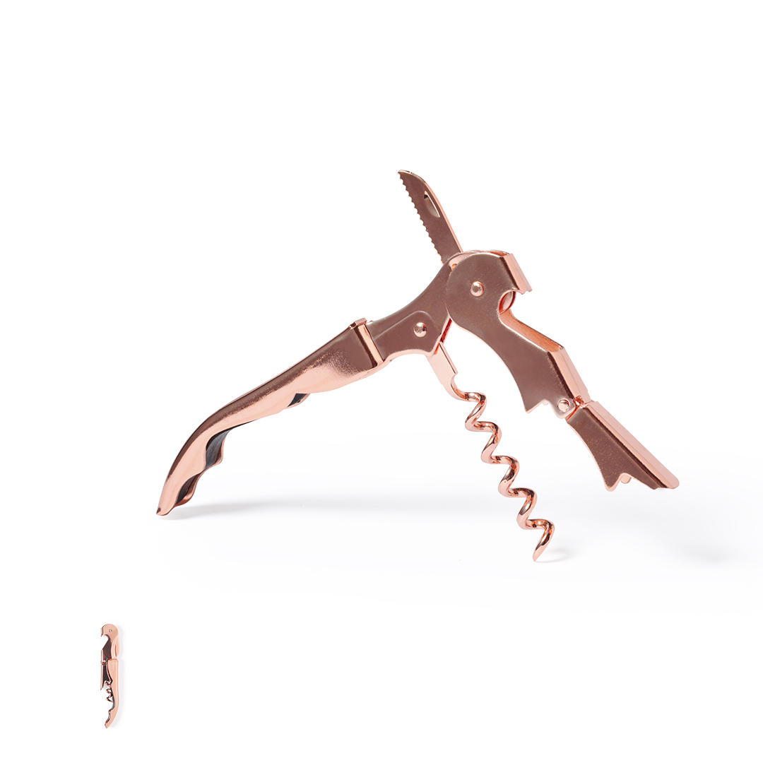 Sacacorchos de 2 tiempos fabricado en acero inox, con recubrimiento exterior en cobre galvanizado. Cortacápsulas integrado y presentado en caja individual de diseño.