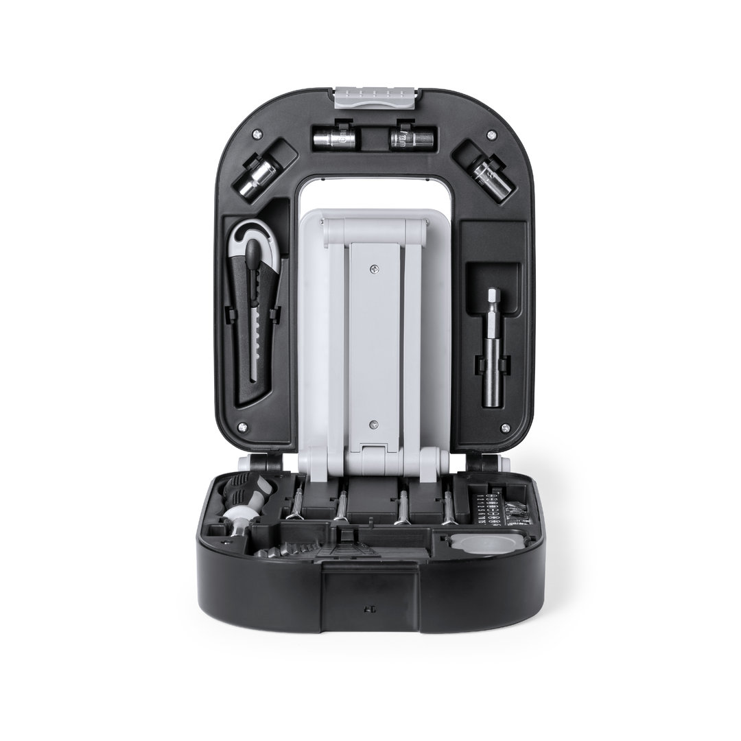 Original set de herramientas con luz y 30 accesorios. Presentado en resistente caja de ABS negra con cierre. Lámpara plegable integrada la caja, con 24 LEDs y botón ON/OFF. Incluye destornillador con multitud de puntas planas, philips, torx… Con kit de destornilladores de precisión llaves de tubo y llaves allen en distintas medidas cutter y flexómetro 1m. Lampará con alimentación a pilas (3xAA no incluidas). Presentado en caja individual de diseño kraft.