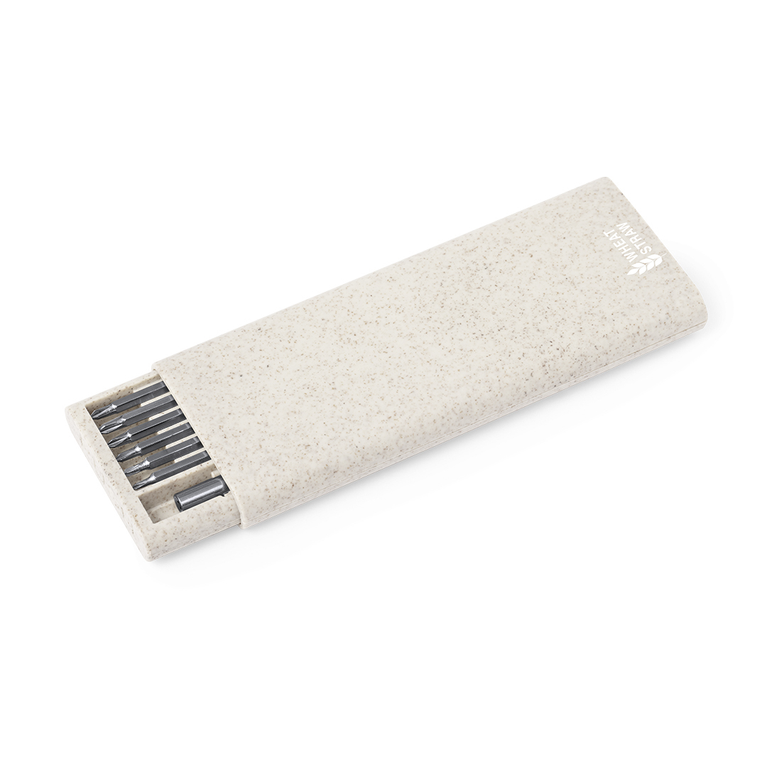 Práctico set de herramientas fabricado en caña de trigo y troquelado interior para un perfecto ajuste. Incluye un destornillador de precisión con 24 accesorios, compuesto por diversas puntas: philips, allen y planas. Con logotipo caña de trigo incluido. Presentado individualmente en caja de diseño kraft. La caña de trigo fomenta la utilización de materias primas naturales, reduciendo así las emisiones contaminantes.