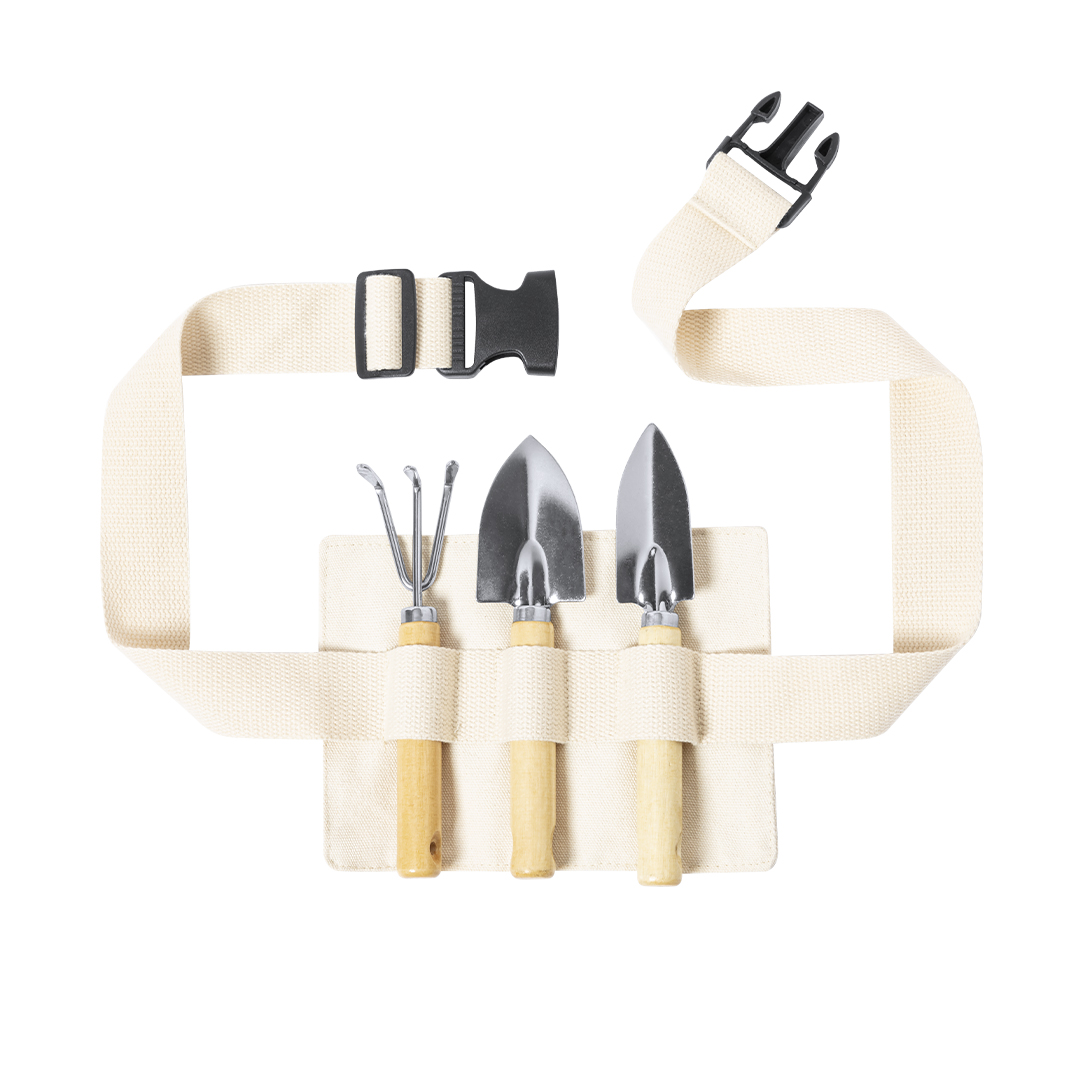 Set de jardinería de 3 accesorios, fabricado en metal con mango de madera. Incluye pala grande, pala pequeña y rastrillo. Con riñonera de transporte en algodón y cierre de click ajustable presentado en atractiva caja de diseño eco.