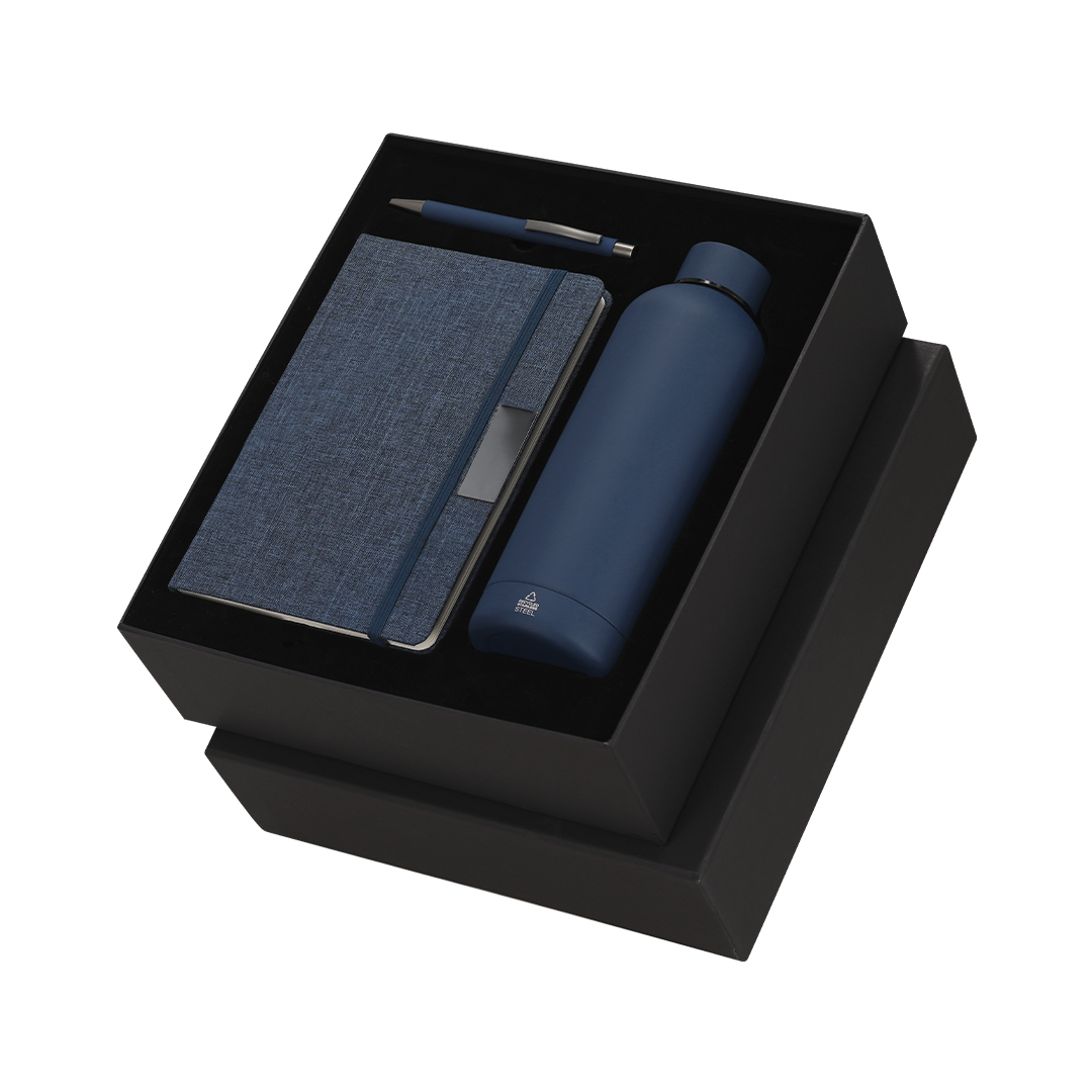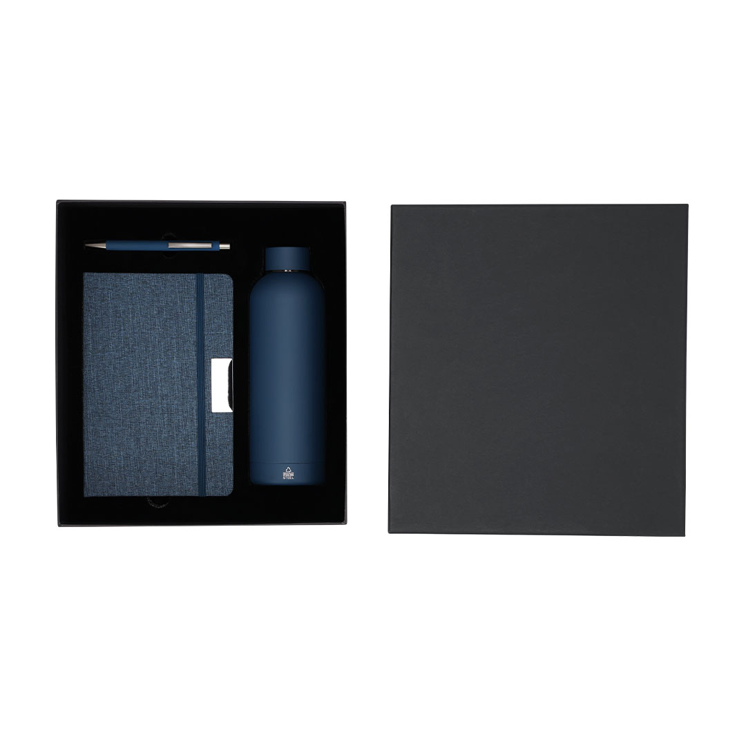 Set de bloc de notas y bolígrafo , además de un bidón térmico fabricado en acero inox.El set incluye:- Bloc de notas de tapas rígidas en RPET, con 80 páginas rayas, banda elástica con clip metálico y marcapáginas a juego.- Bolígrafo de aluminio reciclado en acabado gomoso, carga jumbo y tinta azul.- Bidón térmico de doble pared fabricado en acero inox de 500ml. Con tapón a rosca. Con distintivo logotipo Acero Inoxidable Reciclado.