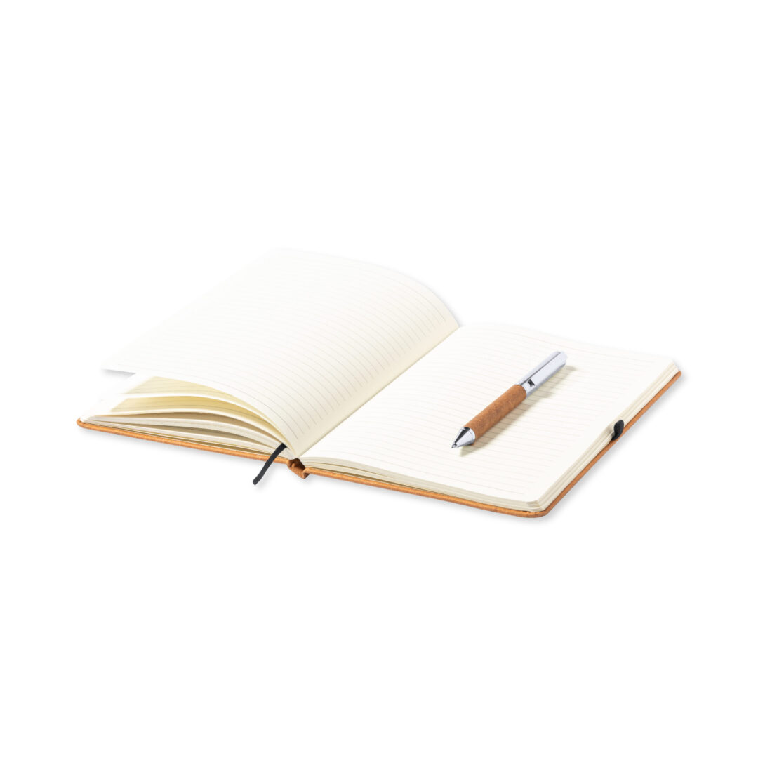 Set de bloc de notas y bolígrafo en cuero reciclado. Incluye: Bloc de notas con tapas rígidas fabricadas en cuero reciclado. Interior con 100 hojas de disposición a una raya. Incluye marcapáginas, elástico de cierre y soporte para bolígrafo a juego. Con distintivo cuero reciclado en contraportada.Bolígrafo fabricado en metal cromado y con cuerpo recubierto en cuero reciclado. Elegante clip metálico y accesorios a juego. De mecanismo giratorio y en tinta azul, con distintivo cuero reciclado en cuerpo.Set presentado en estuche individual de diseño kraft, con compartimento independiente para bloc de notas y bolígrafo.El cuero reciclado rescata las fibras desechadas en los procesos de fabricación del cuero, minimizando el desperdicio de material, contribuyendo a reducir el impacto ambiental y manteniendo a la vez sus propiedades originales.