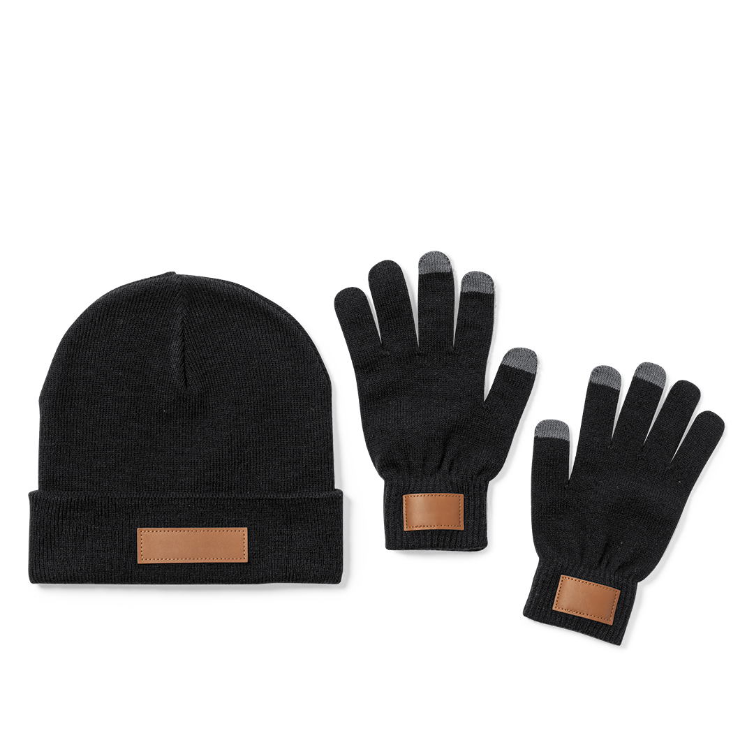 Set de gorro y guantes en talla adulto, fabricados en material acrílico elástico y con parche en polipiel cosido para marcaje. Incluye: Par de guantes con 3 dedos táctiles y elástico de ajuste en muñeca. Gorro a juego con dobladillo.