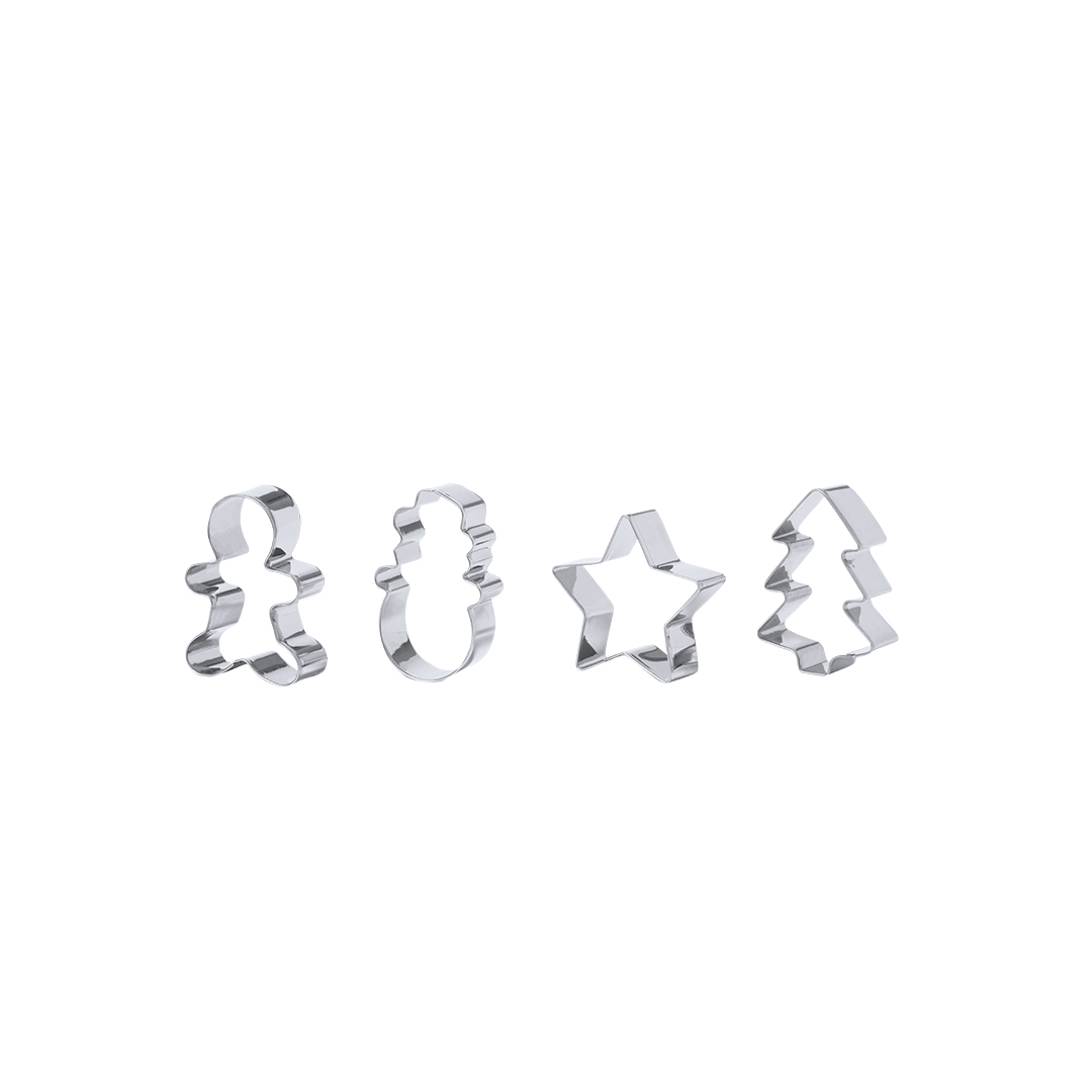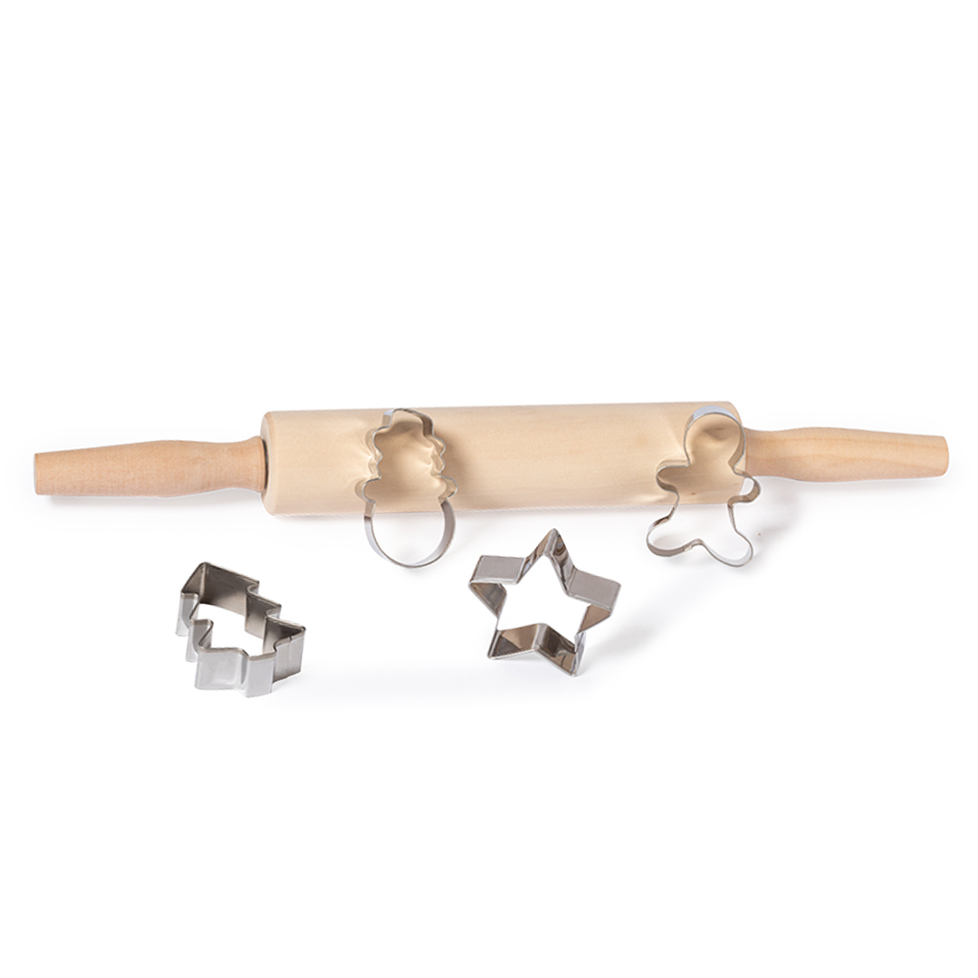 Set de repostería con moldes navideños en acero inoxidable y rodillo fabricado en resistente madera natural. Incluye rodillo amasador y 4 moldes en forma de Árbol de Navidad, Estrella, Muñeco de Nieve y Hombre Jenjibre. Presentado en caja kraft.