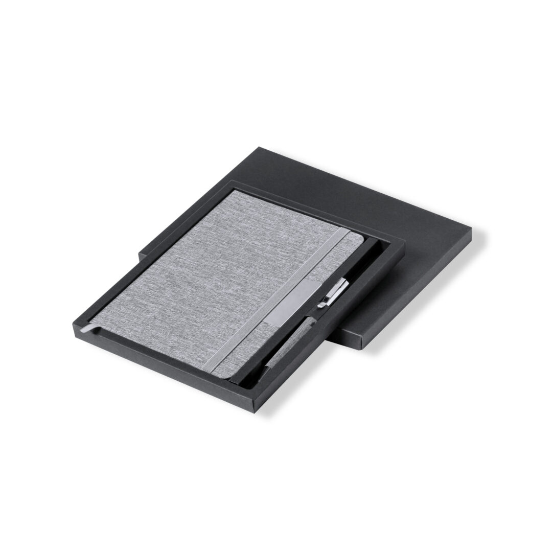 Set de bloc de notas y bolígrafo en RPET, elaborado a partir de plástico reciclado para así fomentar la reutilización de residuos plásticos y ayudar a la sostenibilidad del planeta. Incluye: Bloc de notas de tapas rígidas, con detalle metálico en la portada, marcapáginas de tela y elástico de sujeción a juego. 100 hojas interiores con disposición a una raya y distintivo RPET.Bolígrafo fabricado en metal cromado y con cuerpo recubierto en poliéster RPET. Elegante clip metálico y accesorios a juego, de mecanismo giratorio y en tinta azul. Con distintivo RPET en cuerpo.Set presentado en elegante estuche de diseño en color negro, con compartimento independiente para bloc de notas y bolígrafo.