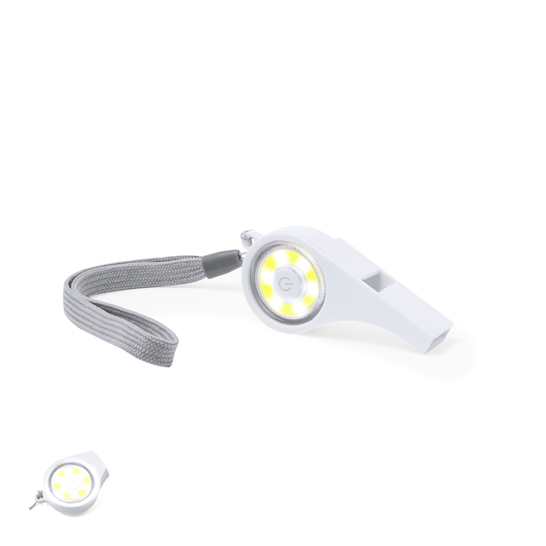 Ingenioso silbato multiusos con luz integrada en el cuerpo. Fabricado en resistente ABS, con 6 luces COB y varias posiciones de iluminación: fija con dos niveles de intensidad e intermitente para una mayor visibilidad. Cordón para un cómodo transporte y está alimentado por una pila de botón (incluida). Presentado en caja de diseño kraft.