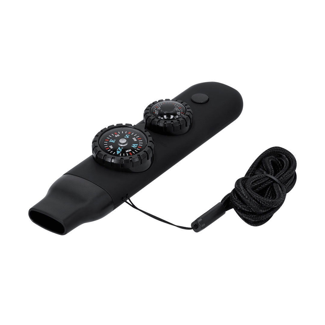 Silbato de supervivencia fabricado en resistente ABS con acabado gomoso. Integra 6 funciones esenciales:- Brújula de 2,55 cm de diámetro, con indicaciones de Norte, Sur, Este y Oeste.- Silbato de alta potencia, ideal para emitir señales de emergencia.- Termómetro con rango de temperaturas de -20 ºC a 50 ºC.- Lupa de 2 cm de diámetro, perfecta para observar detalles pequeños o incluso para encender fuego mediante concentración de luz solar.- Espejo, incorporado en la parte inferior de la brújula.- Linterna con 2 LEDs y botón de encendido/apagado en la parte superior.Incluye un práctico cordón para facilitar su transporte, ideal para llevarlo cómodamente colgado al cuello.