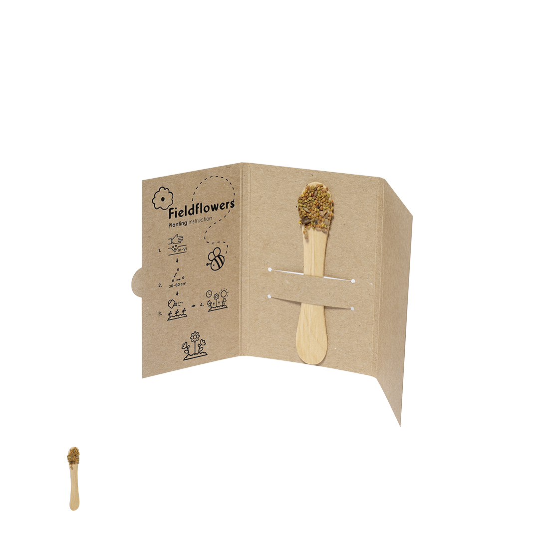 Stick con semillas. En uno de los extremos tiene una zona amplia para marcaje y en el otro extremo incluye semillas de flores silvestres listas para plantar. Presentado en una tarjeta de cartón reciclado con instrucciones de plantado.