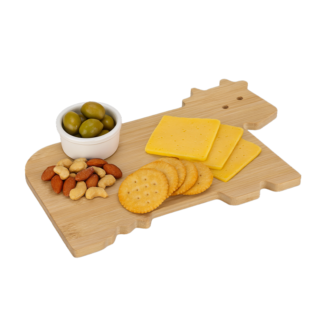 Tabla de cocina con original diseño en forma de vaca, fabricada en suave bambú, muy fácil de limpiar y guardar.