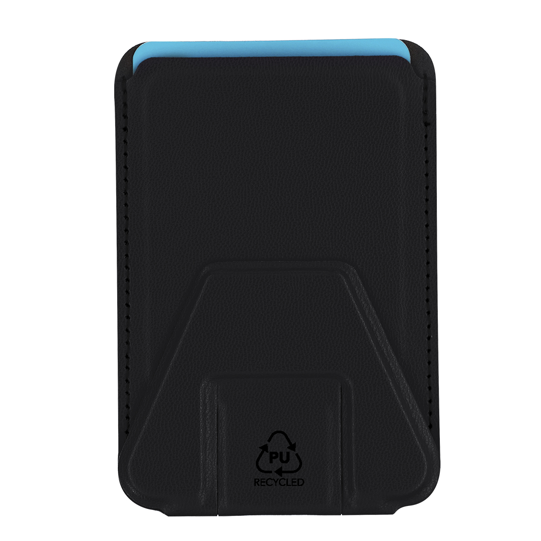 Funda tarjetero en PU Reciclado. Con soporte multifuncional que permite diversas posiciones. Con sistema de fijación adhesiva. Incluye distintivo PU reciclado.La PU Reciclado destaca por su resistencia y elasticidad. Este material reciclado y reciclable es una opción sostenible que rescata las fibras desechadas en los procesos de fabricación, minimizando así el desperdicio de material y contribuyendo a su vez a reducir el impacto ambiental, manteniendo a la vez sus propiedades originales.
