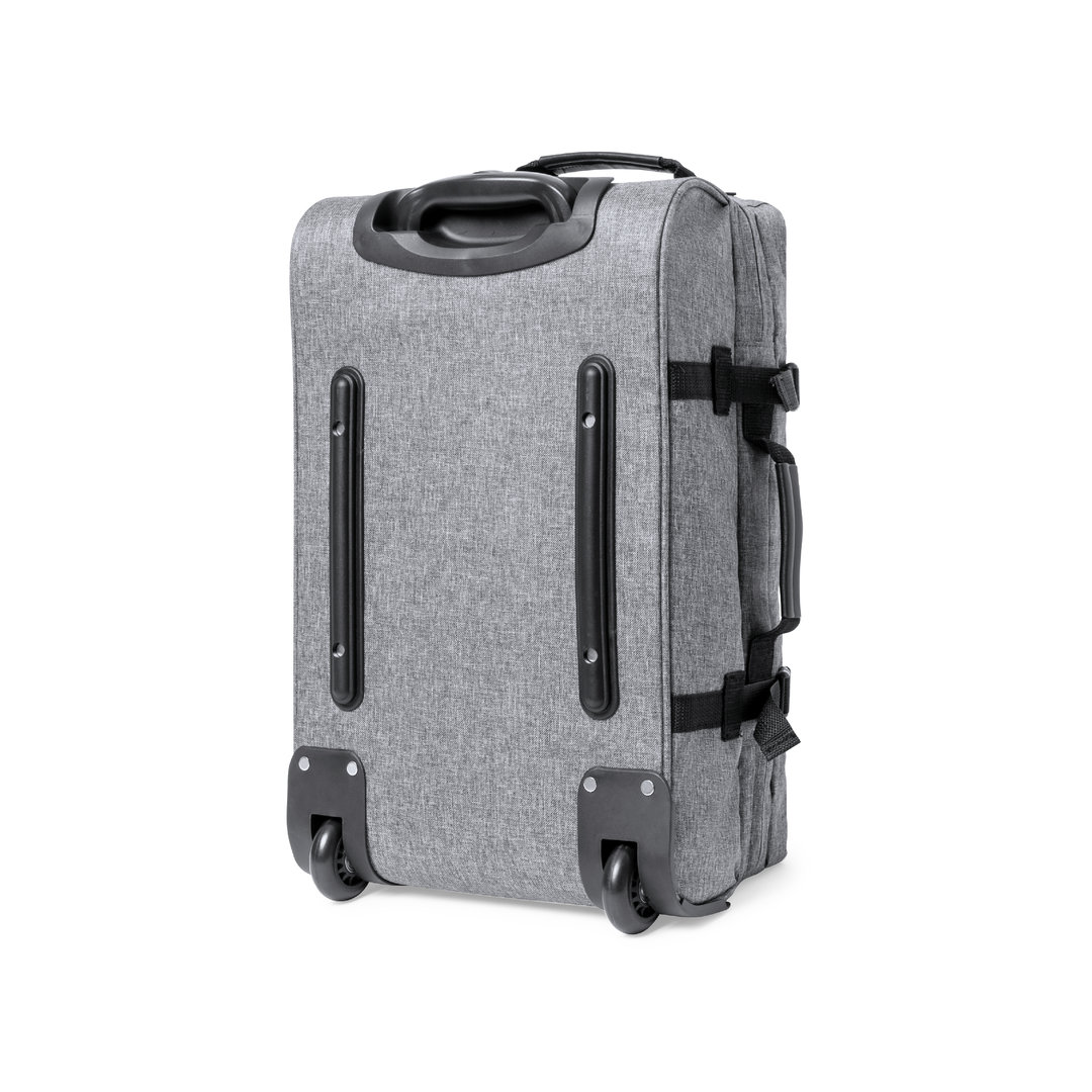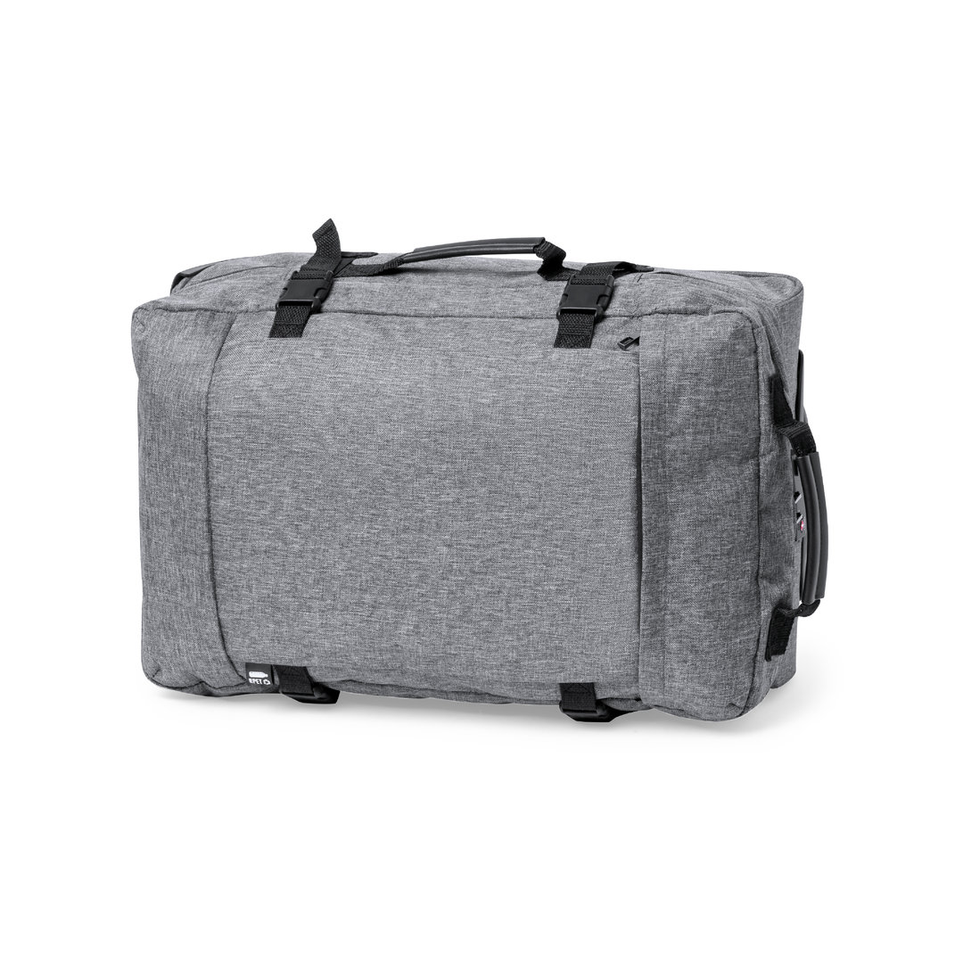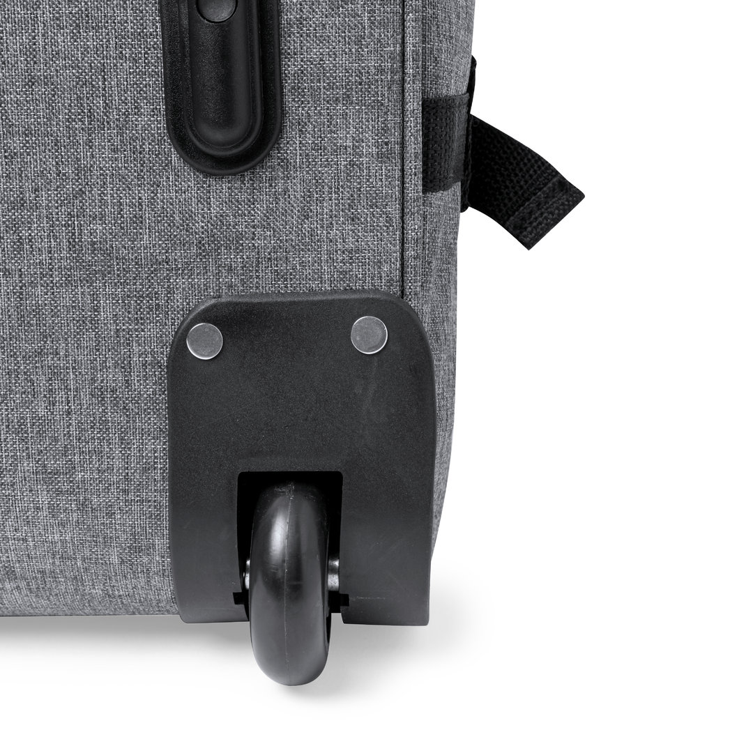 Trolley de línea nature fabricado en resistente 300D RPET. Compartimento principal con cierre de cremallera de doble tirador conforme a los estándares TSA -Administración de la Seguridad en el Transporte-, que permite a las autoridades de aduanas inspeccionar el contenido del equipaje sin tener que forzar o romper el cierre, usando una llave especial a disposición de la autoridad. Interior forrado y con cintas elásticas de sujeción. Exterior con 2 cintas ajustables, cierres de hebilla, bolsillo frontal con cierre de cremallera invisible y 2 asas acolchadas de transporte. Mecanismo extensible metálico en negro, con cómoda asa de transporte y 2 ruedas. Distintivo RPET en etiqueta exterior.